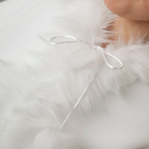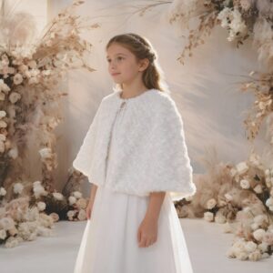 Szukasz okrycia, które zachwyca fakturą i klasycznym wykończeniem? Ta śnieżnobiała pelerynka wykonana z futerka o strukturze różyczek to propozycja dla osób ceniących elegancję w każdym detalu. Jest niezwykle miękka, ciepła i stanowi idealne zwieńczenie komunijnej stylizacji.