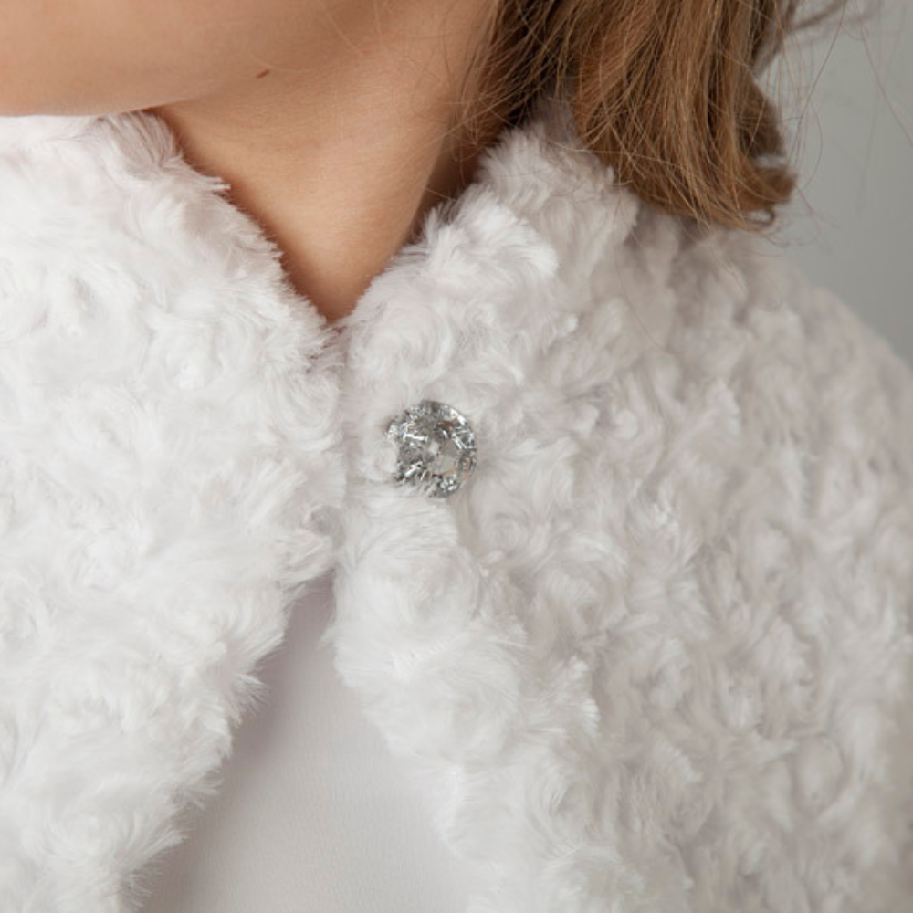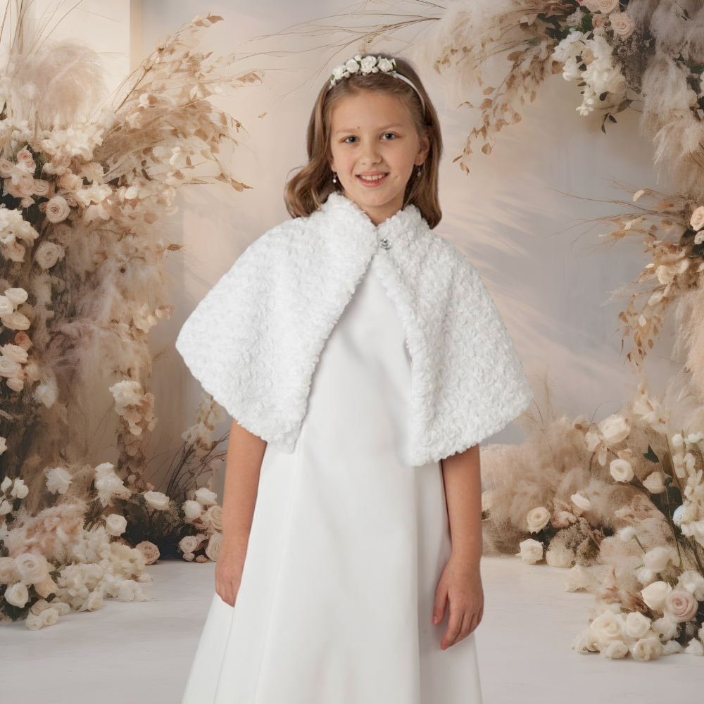 Szukasz okrycia, które zachwyca fakturą i klasycznym wykończeniem? Ta śnieżnobiała pelerynka wykonana z futerka o strukturze różyczek to propozycja dla osób ceniących elegancję w każdym detalu. Jest niezwykle miękka, ciepła i stanowi idealne zwieńczenie komunijnej stylizacji.